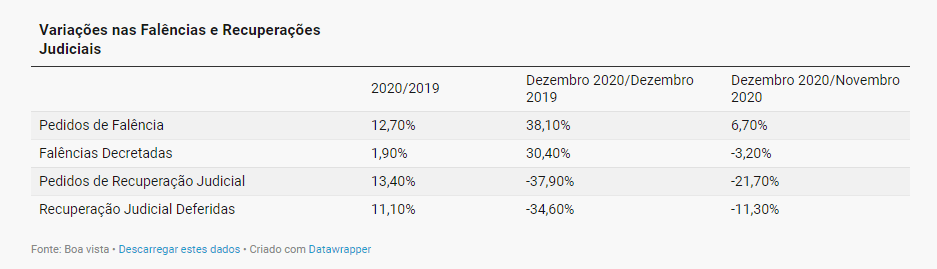Segundo dados do Boa Vista, os pedidos de falência avançaram 12,7% em 2020 em comparação com 2019. No mesmo sentido, mantida a base de comparação, os pedidos de recuperação judicial e as recuperações judiciais deferidas aumentaram 13,4% e 11,1%, respectivamente. As falências decretadas também cresceram no ano, apontando variação de 1,9%.