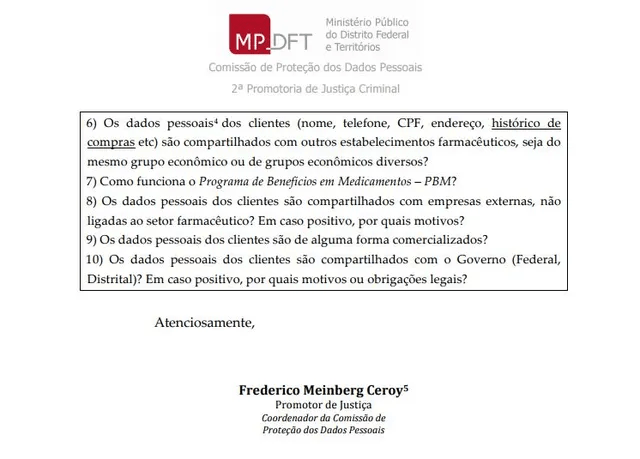 Em janeiro, o MP enviou ao Sindicato do Comércio Varejista de Produtos Farmacêuticos do DF (Sincofarma) uma lista com dez perguntas questionando o tratamento que o setor dá para os dados dos clientes e o porquê da exigência do CPF para oferecer descontos.