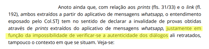 Na decisão proferida pela 10ª Vara do Trabalho do Recife, foram considerados inválidos os prints de conversas do WhatsApp apresentados como prova, citando a “impossibilidade de verificar sua autenticidade.” Essa declaração reflete uma preocupação crescente entre os tribunais sobre a validade das provas digitais, especialmente quando não há mecanismos claros para atestar sua veracidade. Autos de n. 0000821-78.2023.5.06.0010