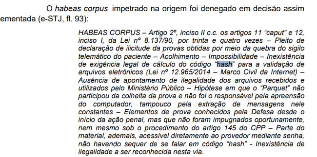 A decisão também menciona o artigo 145 do Código de Processo Penal (CPP), que regula o exame de documentos e provas. Porém, a corte considerou que os requisitos legais foram devidamente observados, e que a autenticidade da prova não foi abalada pela ausência do “hash”.