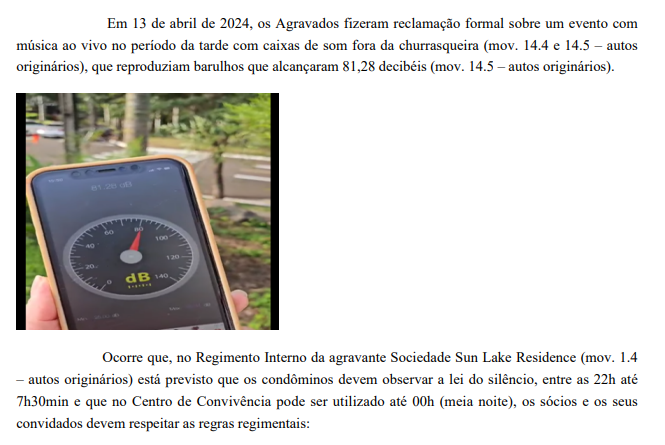 A decisão também reforçou que os ruídos em áreas comuns devem respeitar os limites estabelecidos pela Associação Brasileira de Normas Técnicas (ABNT) e legislações locais, geralmente fixados em 50 dB durante o período noturno e 55 dB durante o dia.