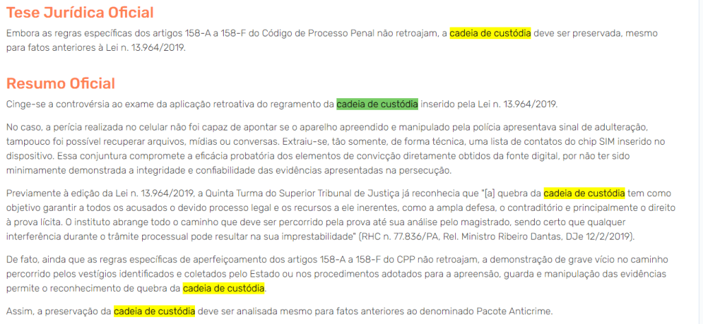 O STJ reafirmou que a preservação da cadeia de custódia é essencial para que as provas possam ser consideradas válidas e admissíveis em um processo judicial. Em casos anteriores à Lei n. 13.964/2019, a ausência de regulamentação formal não isentava as autoridades da responsabilidade de preservar a integridade das provas.