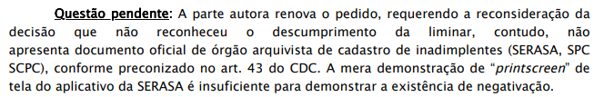 Recentemente, o Tribunal de Justiça de Rondônia decidiu que a apresentação de prints de tela do aplicativo SERASA é insuficiente para demonstrar a existência de negativação (Autos n. 7075293-59.2023.8.22.0001). Essa decisão destaca a importância de provas mais robustas e confiáveis em casos que envolvem alegações de danos morais e outros prejuízos relacionados à negativação indevida.