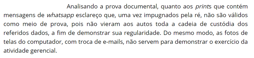Além disso, decisões em outras varas do trabalho têm seguido a mesma linha. Na 7ª Vara do Trabalho de São Paulo – Zona Sul, por exemplo, foi ressaltado que “prints” do WhatsApp são documentos produzidos unilateralmente e que o usuário do aplicativo designa o nome de seus contatos, o que pode comprometer a autenticidade da prova
