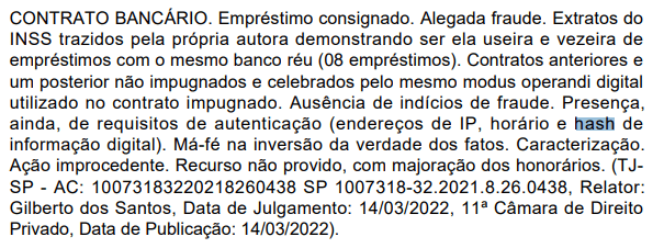 Em recente decisão judicial, o magistrado responsável pelos autos nº 0805875-73.2023.8.10.0060 reconheceu que a apresentação de um hash, quando acompanhada de outros elementos probatórios, é suficiente para comprovar a autenticidade de um contrato de empréstimo consignado.