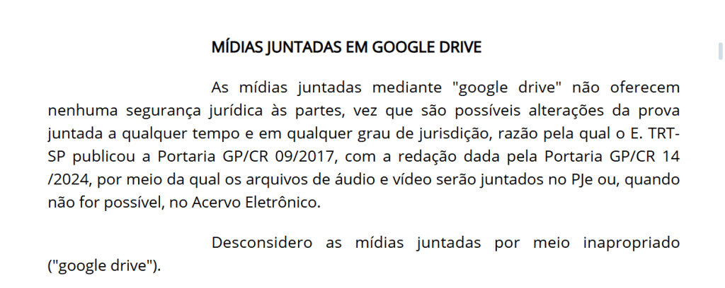 A desconsideração de mídias juntadas via Google Drive pela Justiça do Trabalho reforça a necessidade de adequação das partes às exigências legais para a admissibilidade de provas digitais. O uso de tecnologias seguras e certificações adequadas, conforme preconizado pela Resolução 408/2021 do CNJ, é essencial para garantir que as evidências apresentadas sejam consideradas válidas e eficazes no processo judicial.