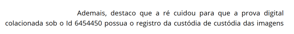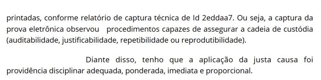 Um exemplo emblemático da aplicação desse princípio é o caso julgado pela 63ª Vara do Trabalho do Rio de Janeiro, no processo nº 0100140-58.2024.5.01.0063. No referido caso, o juízo reconheceu a justa causa aplicada ao empregado com base em provas digitais devidamente coletadas, respeitando a cadeia de custódia. A ré apresentou um relatório de captura técnica, demonstrando que as imagens printadas possuíam registro de custódia, garantindo auditabilidade, justificabilidade, repetibilidade e reprodutibilidade.