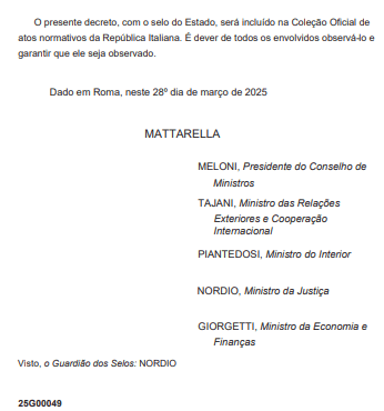 Além disso, o Decreto-Legge de 2025 prevê que a cidadania italiana será concedida apenas a pessoas que possuam um histórico de cumprimento de deveres cívicos, como o exercício de direitos políticos ou a contribuição para a sociedade italiana. O objetivo é evitar que a cidadania seja concedida a indivíduos sem laços reais com a Itália, considerando a segurança nacional e os desafios da globalização.