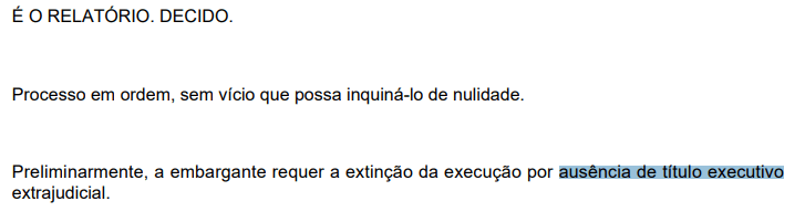 Diante das falhas, a parte executada alegou que o documento não se qualificava como título executivo extrajudicial, argumento acatado pelo juiz de Direito Carlos Alberto de Faria, que declarou a extinção do processo sem resolução do mérito, com fundamento no artigo 485, inciso I, do Código de Processo Civil.