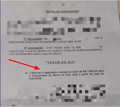 Um condomínio localizado no bairro de Madureira, Zona Norte do Rio de Janeiro, está no centro de uma polêmica após convocar uma reunião extraordinária de moradores com um único item na pauta: aprovar o pagamento mensal de R$ 1.800,00 à chamada “Comunidade do Morro do São José” — denominação comumente utilizada para se referir a uma organização criminosa que atua na área.