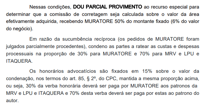 O ministro também observou que a área inicialmente ofertada fazia parte do terreno efetivamente adquirido, não havendo motivo para restringir a base de cálculo da comissão.