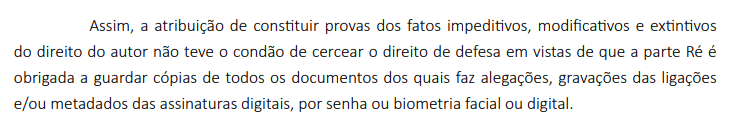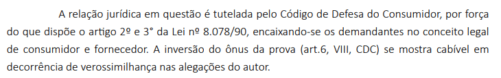 Na fundamentação, o juiz aplicou a inversão do ônus da prova, medida prevista no artigo 6º, inciso VIII1, do Código de Defesa do Consumidor (CDC), em razão da vulnerabilidade da consumidora. Com essa inversão, coube à instituição financeira comprovar a legitimidade da contratação.