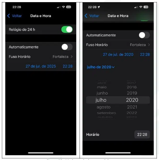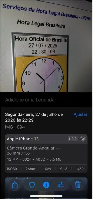 Para ilustrar, foi realizado um teste prático: em 27 de julho de 2025, a data de um iPhone 13 foi alterada para 27 de julho de 2020. Ao fotografar o site oficial da Hora Legal Brasileira, os metadados da foto refletiram a data falsa, não a real. Isso evidencia como, mesmo sem adulterar o conteúdo, a simples alteração temporal pode comprometer a credibilidade do vestígio.