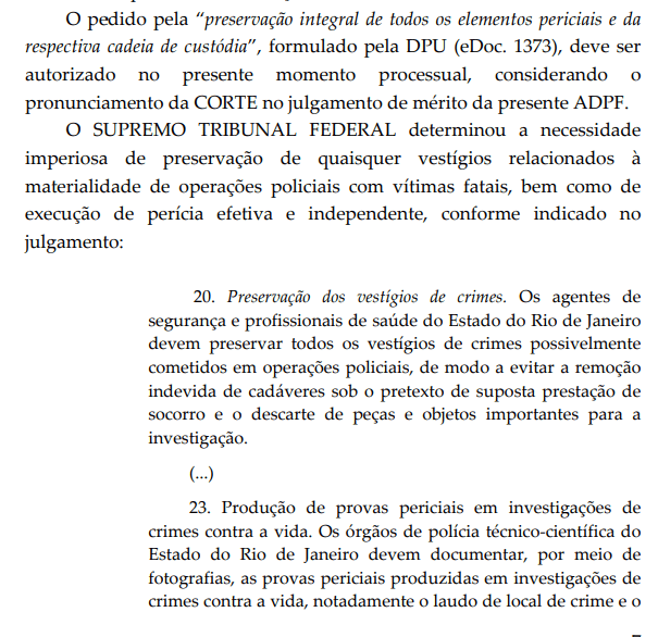 O Supremo Tribunal Federal (STF)1, por determinação do ministro Alexandre de Moraes, ordenou a preservação rigorosa e integral de todas as provas relacionadas à recente ação policial no Rio de Janeiro, que resultou na morte de mais de 120 pessoas nas comunidades do Complexo do Alemão e da Penha.