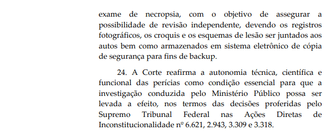 Outro ponto relevante da decisão é a ênfase na independência técnica das perícias um princípio previsto na Lei nº 12.030/2009, que assegura aos peritos oficiais autonomia técnica e funcional no exercício de suas funções.