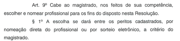 O Art. 9º da Resolução estabelece que cabe ao magistrado escolher e nomear o profissional habilitado para atuar no processo. Seu §1º reforça que a escolha se dará entre os peritos cadastrados, por nomeação direta do profissional ou por sorteio eletrônico, a critério do magistrado..