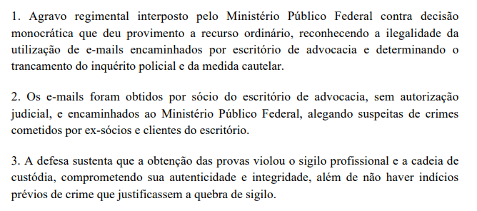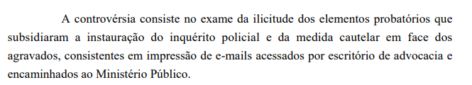 Segundo o STJ, manter a investigação nessas condições violaria: o devido processo legal, a imparcialidade da persecução penal, a cadeia de custódia, o sigilo das comunicações, o sigilo profissional.