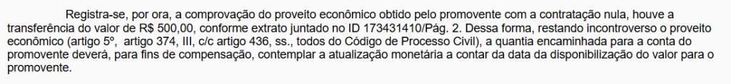 A ausência dessas formalidades levou o Juízo a reconhecer a nulidade do negócio jurídico, por inobservância dos requisitos legais essenciais à sua validade. Como consequência, determinou-se a restituição em dobro dos valores indevidamente descontados, nos termos do art. 42, parágrafo único, do CDC, autorizando-se, contudo, a compensação do valor que efetivamente teria sido creditado ao autor. Além disso, foi fixada indenização por danos morais no valor de R$ 3.000,00, em razão dos descontos indevidos e da violação à dignidade do consumidor.