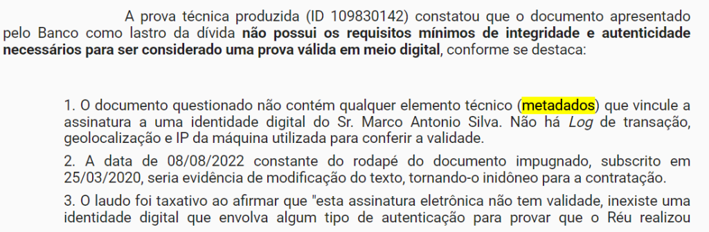 O laudo pericial digital, peça central do convencimento judicial, demonstrou que o contrato apresentado não continha metadados mínimos capazes de vincular a assinatura eletrônica à identidade digital do suposto contratante.