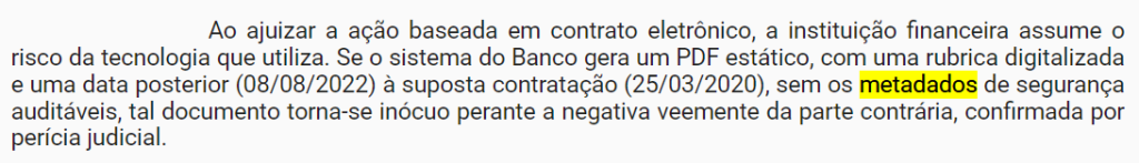 A sentença foi clara ao afirmar que, sem metadados e sem elementos técnicos auditáveis, o contrato eletrônico não possui eficácia probatória, sendo incapaz de demonstrar a existência da obrigação alegada. Aqui, observa-se um ponto fundamental: o ônus da prova não se satisfaz com a mera aparência documental, especialmente quando se trata de documentos digitais.