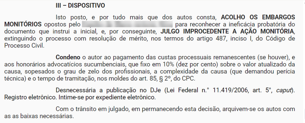 Diante das conclusões periciais, o Juízo reconheceu que o documento eletrônico apresentado não atendia aos requisitos legais de prova escrita, exigidos para o ajuizamento da ação monitória.