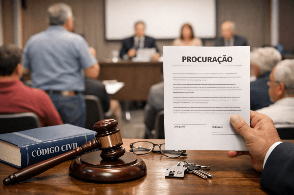 A possibilidade de representação decorre das regras gerais do mandato previstas no Código Civil (arts. 653 a 692)1, aplicáveis subsidiariamente às relações condominiais, bem como das disposições específicas contidas na convenção de condomínio e, quando existentes, no regimento interno. Assim, salvo restrição expressa na convenção, é lícito ao condômino se fazer representar por terceiro munido de procuração válida, com poderes suficientes para participar, discutir e votar nas matérias constantes da ordem do dia.