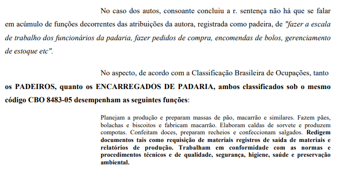 Outro aspecto relevante foi a utilização da Classificação Brasileira de Ocupações (CBO) como elemento interpretativo. Conforme destacado no voto, tanto os padeiros quanto os encarregados de padaria compartilham atribuições como elaboração de registros, requisições de materiais e relatórios de produção.